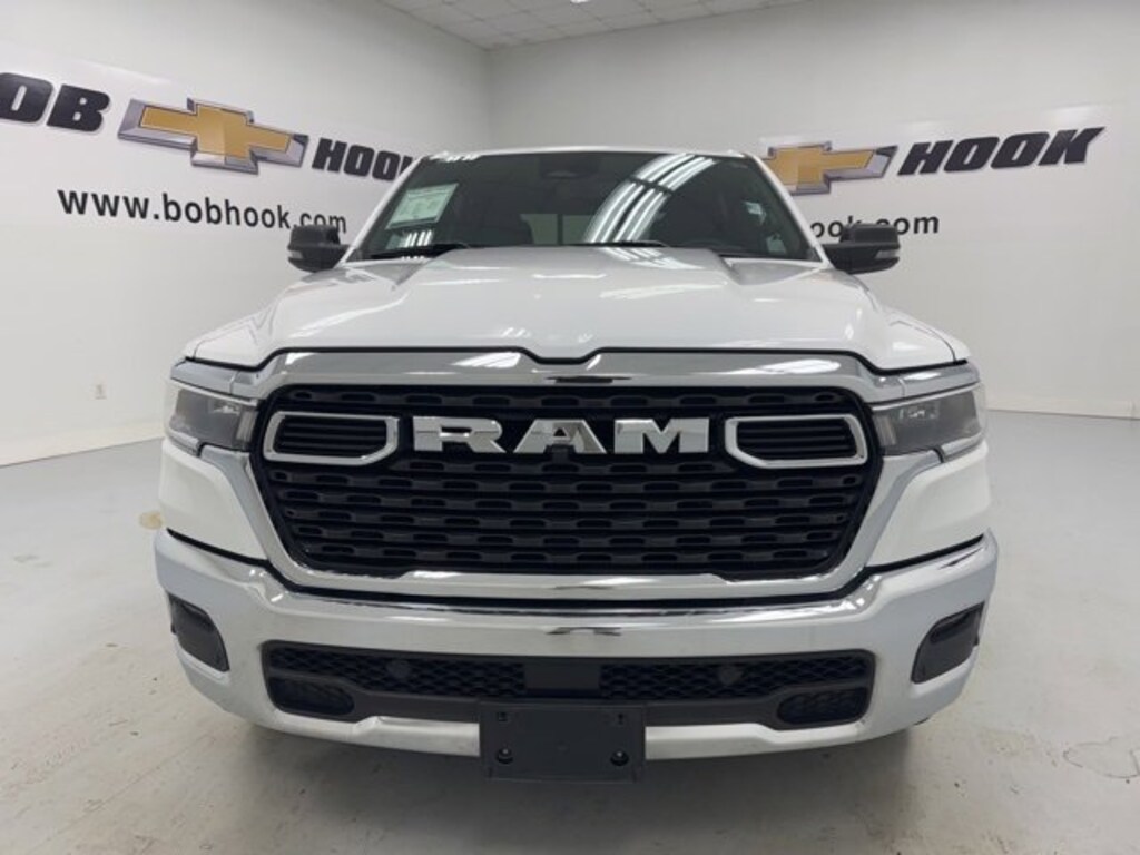 This 2025 Ram 1500 comes equipped with Big Horn Level 2 Equipment Group (115V Auxiliary Power Outlet, 115V Auxiliary Rear Power Outlet, 12 Touchscreen Display, 2nd Row In Floor Storage Bins, 400W Inverter, 4G LTE Wi-Fi Hot Spot, 9 Amplified Speakers w/Subwoofer, Air Conditioning ATC w/Dual Zone Control, Apple CarPlay, Auto Power-Folding Mirrors, Auto-Dimming Exterior Driver Mirror, Auto-Dimming Rear-View Mirror, Black Exterior Mirrors, Black Premium Power Mirrors, Cluster 7.0 TFT Color Display, Configurable Drive Mode, Connected Travel & Traffic Services, Connectivity - US/Canada, Convex Wide-Angle Exterior Mirror Insert, Exterior Mirrors Courtesy Lamps, Exterior Mirrors w/Heating Element, Exterior Mirrors w/Supplemental Signals, Glove Box Lamp, Google Android Auto, GPS Antenna Input, GPS Navigation, HD Radio, Heated Front Seats, Heated Steering Wheel, Integrated Voice Command w/Bluetooth, Leather Wrapped Steering Wheel, LED Dome Lamp w/On/Off Switch, LED Footwell Lighting, Media Hub w/2 Charge Only USBs, Overhead LED Lamps, Power 2-Way Driver Lumbar Adjust, Power Adjust 8-Way Driver Seat, Power Adjustable Pedals, Premium Overhead Console, Radio: Uconnect 5 Nav w/12.0 Display, Rear Power Sliding Window, Rear Window Defroster, Remote Tailgate Release, Security Alarm, SiriusXM w/360L, Steering Wheel Mounted Audio Controls, Sun Visors w/Illuminated Vanity Mirrors, Universal Garage Door Opener, and USB Host Flip), Quick Order Package 21Z Big Horn, 3 Rear Seat Head Restraints, 4 Way Front Headrests, 4-Wheel Disc Brakes, 6 Speakers, ABS brakes, Air Conditioning, Alloy wheels, AM/FM radio, Apple CarPlay/Android Auto, Auto High-beam Headlights, Brake assist, Bumpers: chrome, Cloth Bench Seat, Compass, Delay-off headlights, Driver door bin, Dual front impact airbags, Dual front side impact airbags, Electronic Stability Control, Front anti-roll bar, Front Center Armrest w/Storage, Front fog lights, Front License Plate Bracket, Front reading lights, Front Seat Back Map Pockets, Front wheel independent suspension, Fully automatic headlights, Heated door mirrors, Illuminated entry, Low tire pressure warning, Manual Adjust 4-Way Front Passenger Seat, Manual Folding Exterior Mirrors, Manufacturer's Statement of Origin, Occupant sensing airbag, Outside temperature display, Overhead airbag, Overhead console, Panic alarm, ParkView Rear Back-Up Camera, Passenger door bin, Passenger vanity mirror, Power door mirrors, Power steering, Power windows, Radio data system, Radio: Uconnect 5 W w/8.4 Display, RAM Grille Badge - Chrome, Rear 60/40 Folding Seat, Rear anti-roll bar, Rear seat center armrest, Rear step bumper, Remote keyless entry, Speed control, Split folding rear seat, Supplier Part Tracking (J-1), Tachometer, Telescoping steering wheel, Tilt steering wheel, Traction control, Trip computer, Variably intermittent wipers, Voltmeter, and Wheels: 18 x 8 Cast-Aluminum Painted.