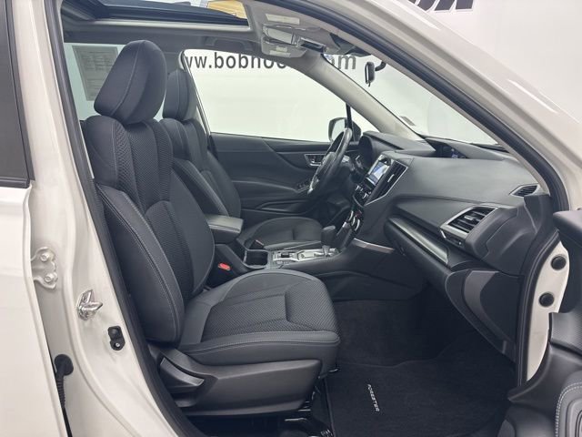 This 2022 Subaru Forester comes equipped with Blind Spot Detection w/RCTA & Power Rear Gate (Blind Spot Detection (BSD), Driver's Seatback Divided Pocket, Dual USB Charge Ports, EyeSight System, Multi-Function High Grade Display, and Power Rear Gate), 3.70 Axle Ratio, 4-Wheel Disc Brakes, 6 Speakers, ABS brakes, Air Conditioning, Alloy wheels, AM/FM radio: SiriusXM, Anti-whiplash front head restraints, Auto High-beam Headlights, Automatic temperature control, Brake assist, Bumpers: body-color, CD player, Driver door bin, Driver vanity mirror, Dual front impact airbags, Dual front side impact airbags, Electronic Stability Control, Emergency communication system: STARLINK Safety and Security (Subscription Required), Exterior Parking Camera Rear, Four wheel independent suspension, Front anti-roll bar, Front Bucket Seats, Front Center Armrest, Front fog lights, Front reading lights, Fully automatic headlights, Heated door mirrors, Heated Front Bucket Seats, Heated front seats, Illuminated entry, Knee airbag, Low tire pressure warning, Occupant sensing airbag, Outside temperature display, Overhead airbag, Overhead console, Panic alarm, Passenger door bin, Passenger vanity mirror, Power door mirrors, Power driver seat, Power moonroof: Panoramic, Power steering, Power windows, Premium Cloth Upholstery, Radio data system, Radio: Subaru Starlink 6.5 Multimedia Plus System, Rear anti-roll bar, Rear seat center armrest, Rear window defroster, Rear window wiper, Remote keyless entry, Roof rack: rails only, Security system, Speed control, Speed-sensing steering, Split folding rear seat, Spoiler, STARLINK/Apple CarPlay/Android Auto, Steering wheel mounted audio controls, Tachometer, Telescoping steering wheel, Tilt steering wheel, Traction control, Trip computer, Variably intermittent wipers, and Wheels: 17 x 7.0J Black Machine Finish Alloy.