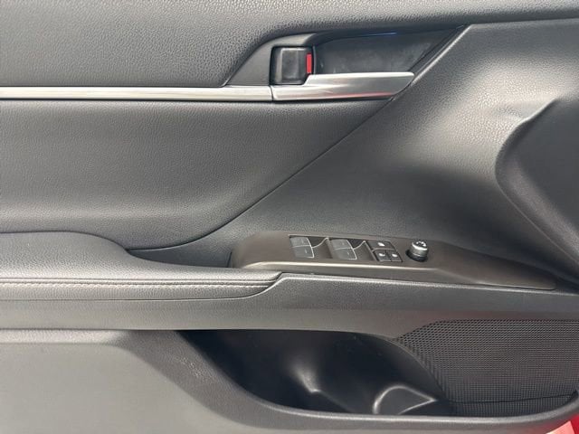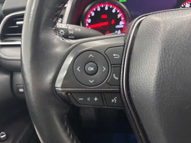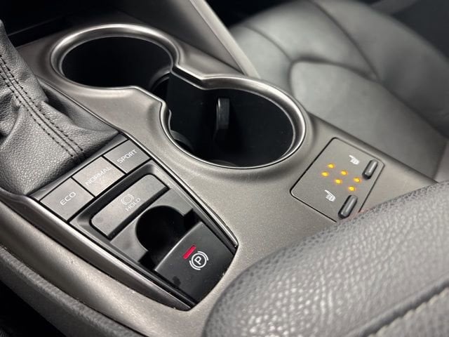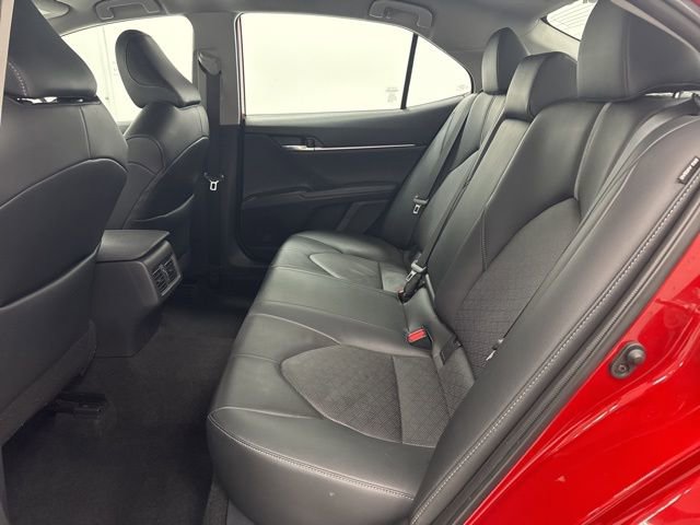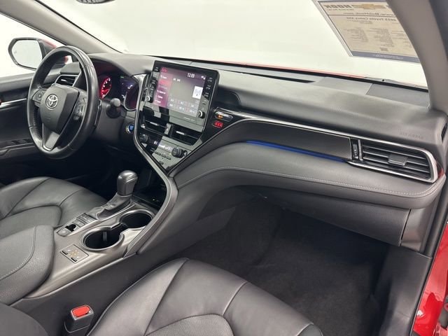 This 2023 Toyota Camry comes equipped with Black Leather, 4-Wheel Disc Brakes, 6 Speakers, ABS brakes, Air Conditioning, Alloy wheels, AM/FM radio: SiriusXM, Apple CarPlay/Android Auto, Auto High-beam Headlights, Auto-dimming Rear-View mirror, Automatic temperature control, Brake assist, Bumpers: body-color, Delay-off headlights, Driver door bin, Driver vanity mirror, Dual front impact airbags, Dual front side impact airbags, Electronic Stability Control, Emergency communication system: Safety Connect (1-year trial), Exterior Parking Camera Rear, Four wheel independent suspension, Front anti-roll bar, Front Bucket Seats, Front Center Armrest, Front dual zone A/C, Front reading lights, Fully automatic headlights, Garage door transmitter: HomeLink, Heated door mirrors, Heated front seats, Illuminated entry, Knee airbag, Leather steering wheel, Low tire pressure warning, Multi-Stage Heated Front Bucket Seats, Occupant sensing airbag, Outside temperature display, Overhead airbag, Overhead console, Panic alarm, Passenger door bin, Passenger vanity mirror, Perforated Leather Seat Trim, Power door mirrors, Power driver seat, Power passenger seat, Power steering, Power windows, Radio data system, Radio: Audio Plus, Rear anti-roll bar, Rear reading lights, Rear seat center armrest, Rear side impact airbag, Rear window defroster, Remote keyless entry, Security system, Speed control, Speed-sensing steering, Split folding rear seat, Spoiler, Steering wheel mounted audio controls, Tachometer, Telescoping steering wheel, Tilt steering wheel, Traction control, Trip computer, Turn signal indicator mirrors, Variably intermittent wipers, and Wheels: 8.0J x 19 Alloy.